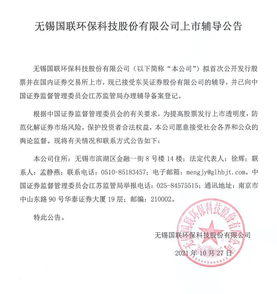無錫國(guó)聯(lián)環(huán)保科技股份有限公司成立于2011年1月27日,是一家以污泥減量化、無害化、資源化處置為產(chǎn)業(yè)化發(fā)展的國(guó)有控股企業(yè),股本為109,470,852元。